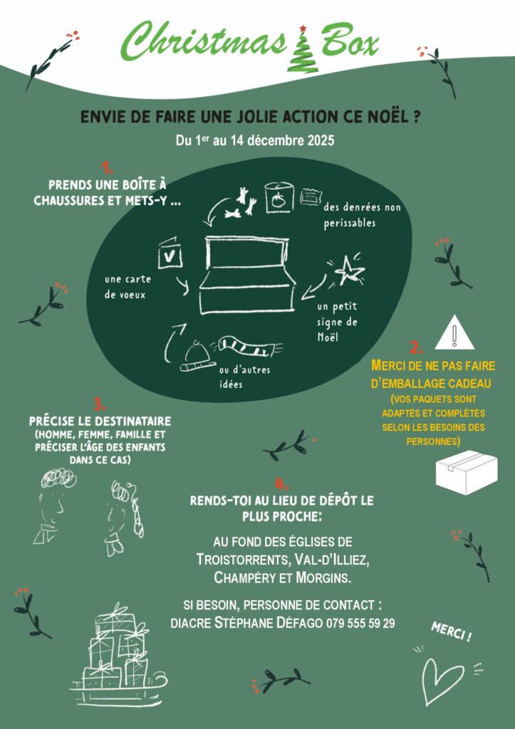ChristmasBox – solidarité Vivre la solidarité dans notre région! Préparer un cadeau de Noël (indications ci-dessus), à déposer au fond des églises, qui sera ensuite redistribué aux personnes dans le besoin de notre région. MERCI BEAUCOUP!!! Pierre-Yves Pralong2025-12-03T08:42:04+00:0030 novembre 2025| Articles similaires Soirée Louange Champéry Soirée Louange Champéry 2 décembre 2025 Messes en famille Messes en famille 1 décembre 2025 Messes de Noël et confessions Messes de Noël et confessions 30 novembre 2025 GPS – Go Pray Share GPS – Go Pray Share 29 novembre 2025 Éveil à la foi Éveil à la foi 13 novembre 2025 Groupe Jeunes (dès 16 ans) Groupe Jeunes (dès 16 ans) 12 novembre 2025 Soirées Louange Soirées Louange 10 novembre 2025 Adoration permanente Adoration permanente 12 août 2023